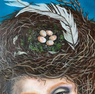 What ended up appearing was actually an amazing representation of how I was feeling and it wasn’t even conscious. Everything in this painting exudes a fragility and vulnerability that is very tactile. Even the bones in her hands are delicate and small. Her expression is a gaze that is both penetrating and somewhat...exhausted. She hold the cycles of nature on her shoulders and upon her head. Never apart from the nature and wildness of Life, and comforted by the warmth that loving presence can bring (fox on her shoulders) and the rebirth of spring anew (the bird eggs).